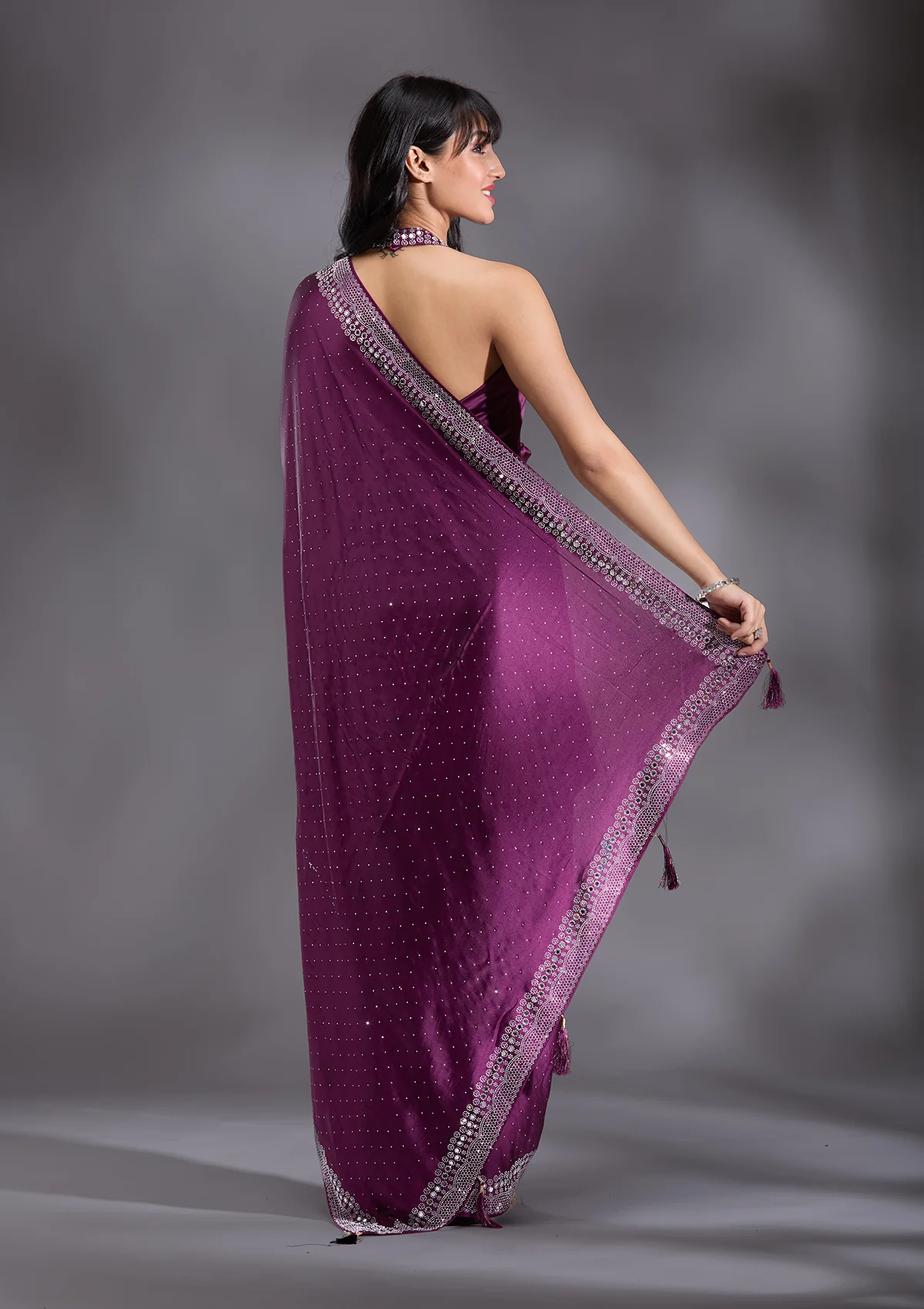Purple Silver Stonework Satin Saree